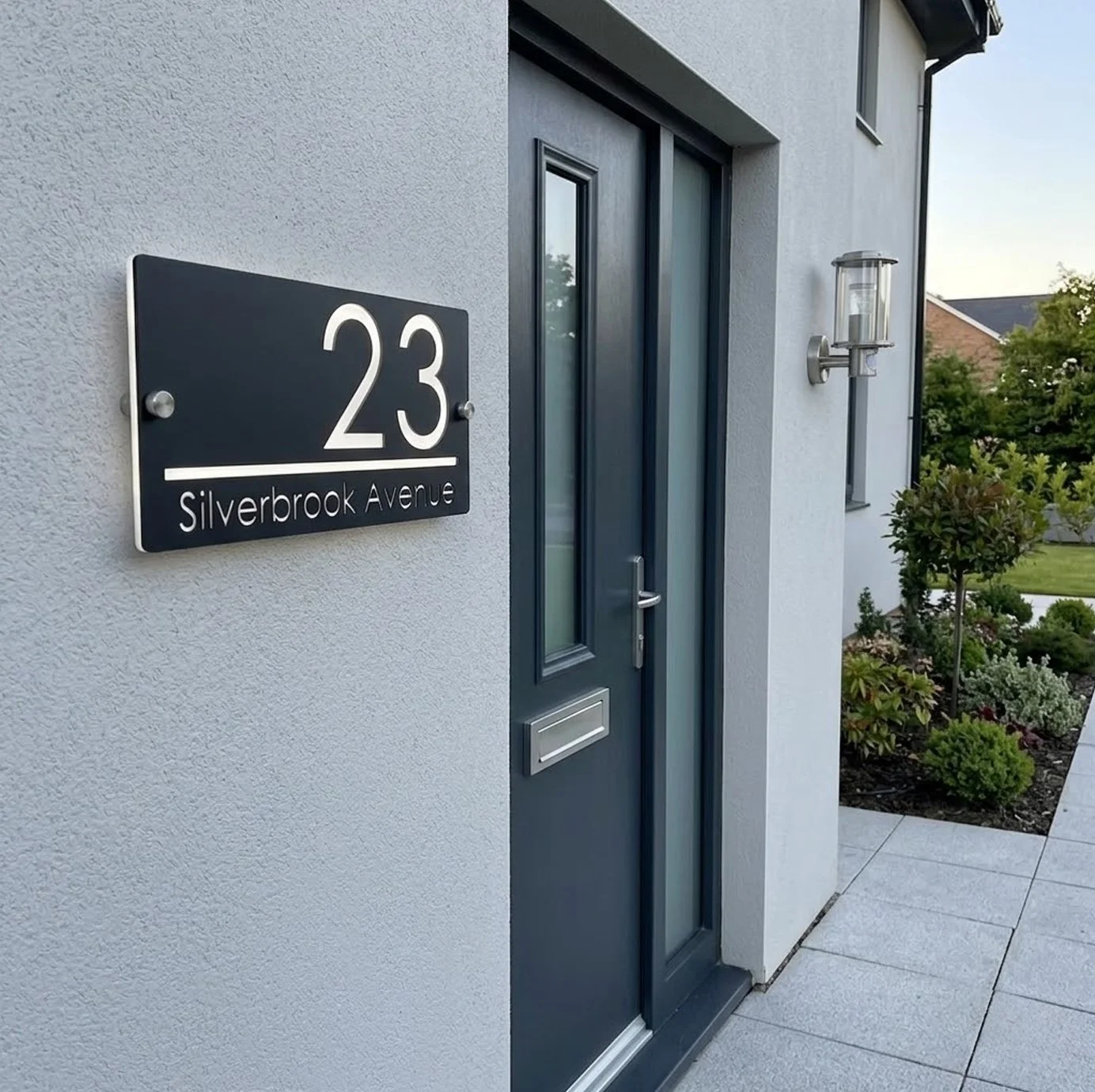 Personalised house signs, address plaques and house numbers designed for modern façades, entryways and exterior walls. These signs can be tailored in size, layout, material and finish to suit different home styles and architectural settings.